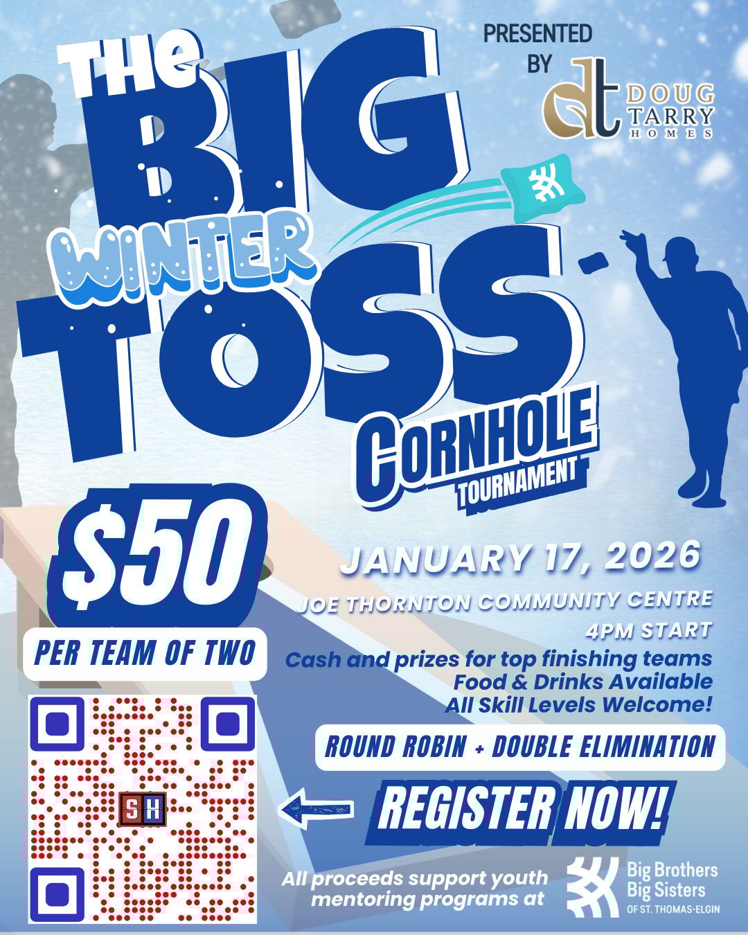 Compete for cash and prizes while supporting life-changing mentoring relationships for children and youth in Elgin County through Big Brothers Big Sisters. Stay cozy and enjoy the festive atmosphere as you toss your way to victory—no snow boots required! Licensed beverages and tasty food will be available for purchase throughout the evening. All skill levels welcome!